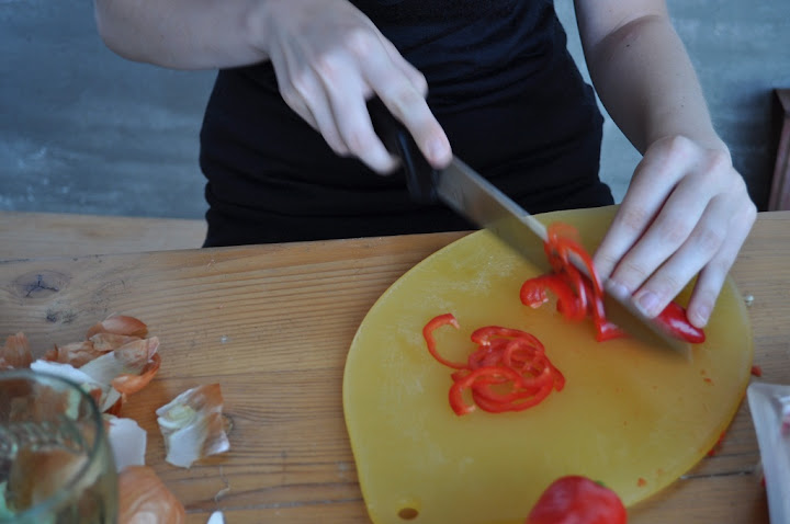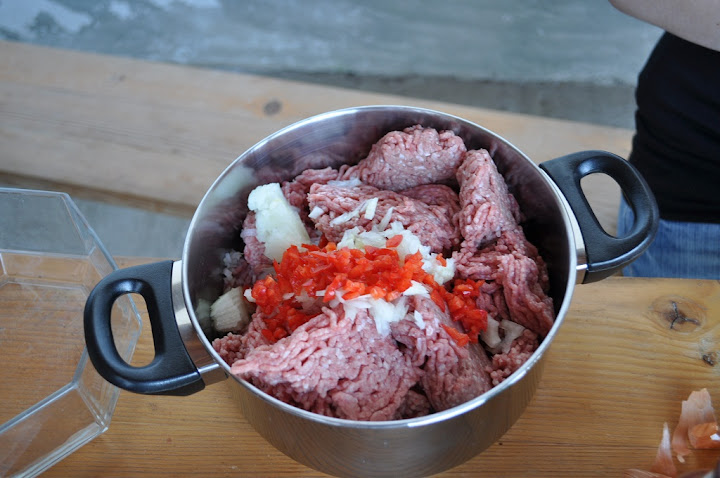 Für die Amadillo-Eggs wurde roter Paprika klein geschnitten, dieser kam mit Schmelzkäse ins Innere der Bombe.